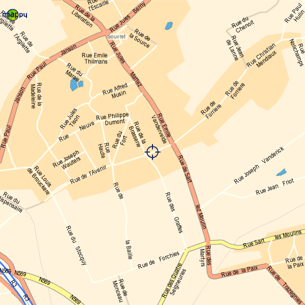 Quitter le R3 à la sortie "Forchies-la-Marche, Courcelles". Prendre la direction de Courcelles. Après être passé sur le pont de l'autoroute, prendre la 1ère à droite et continuer tout droit : 200 mètres avant les feux de signalisations, vous êtes arrivés.