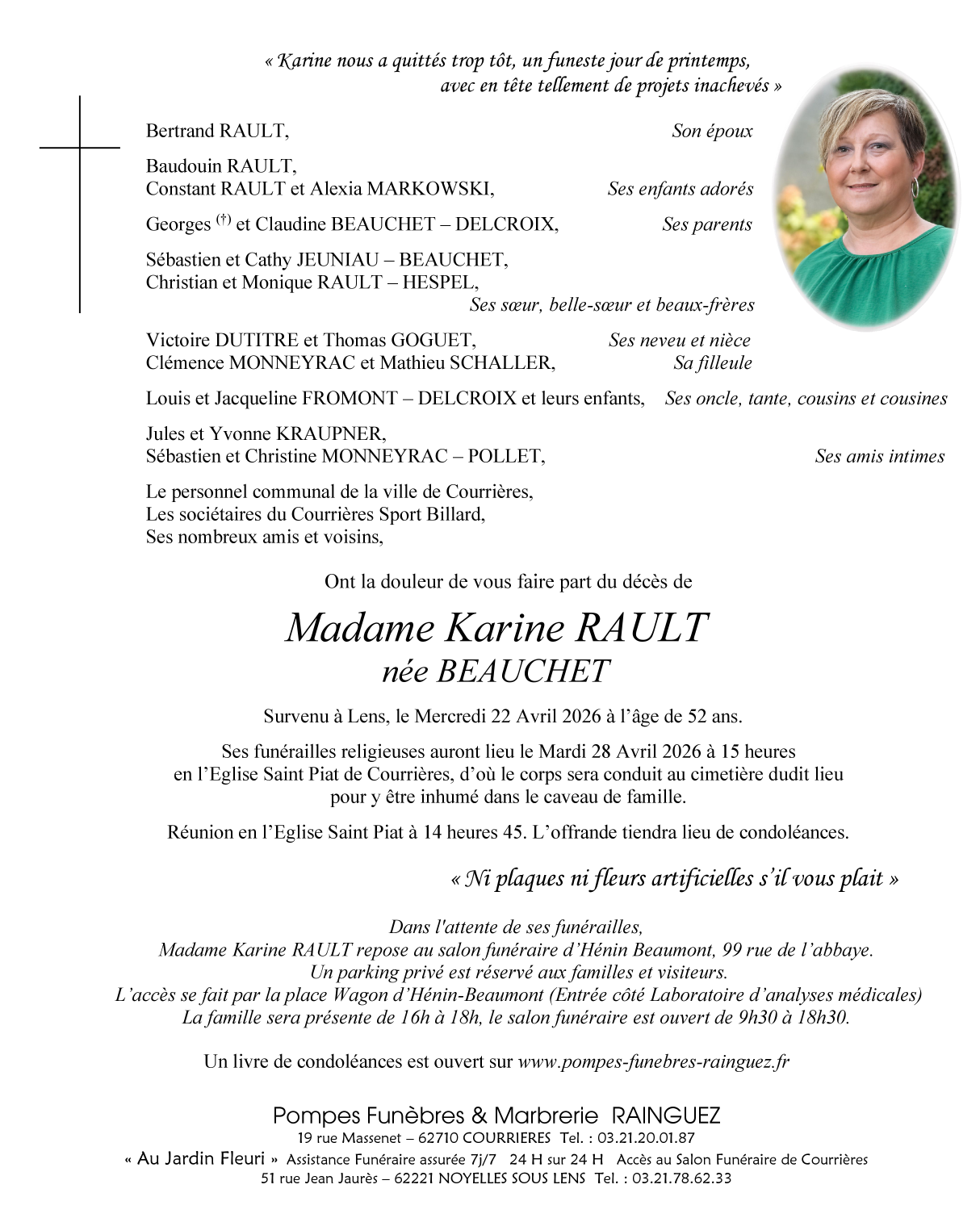 Avis de décès de Madame Karine RAULT née BEAUCHET