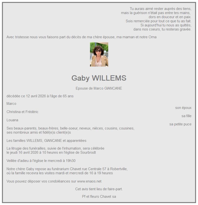 Décédée à Eupen (4700) le dimanche 12 avril 2026 à l'âge de 65 ans