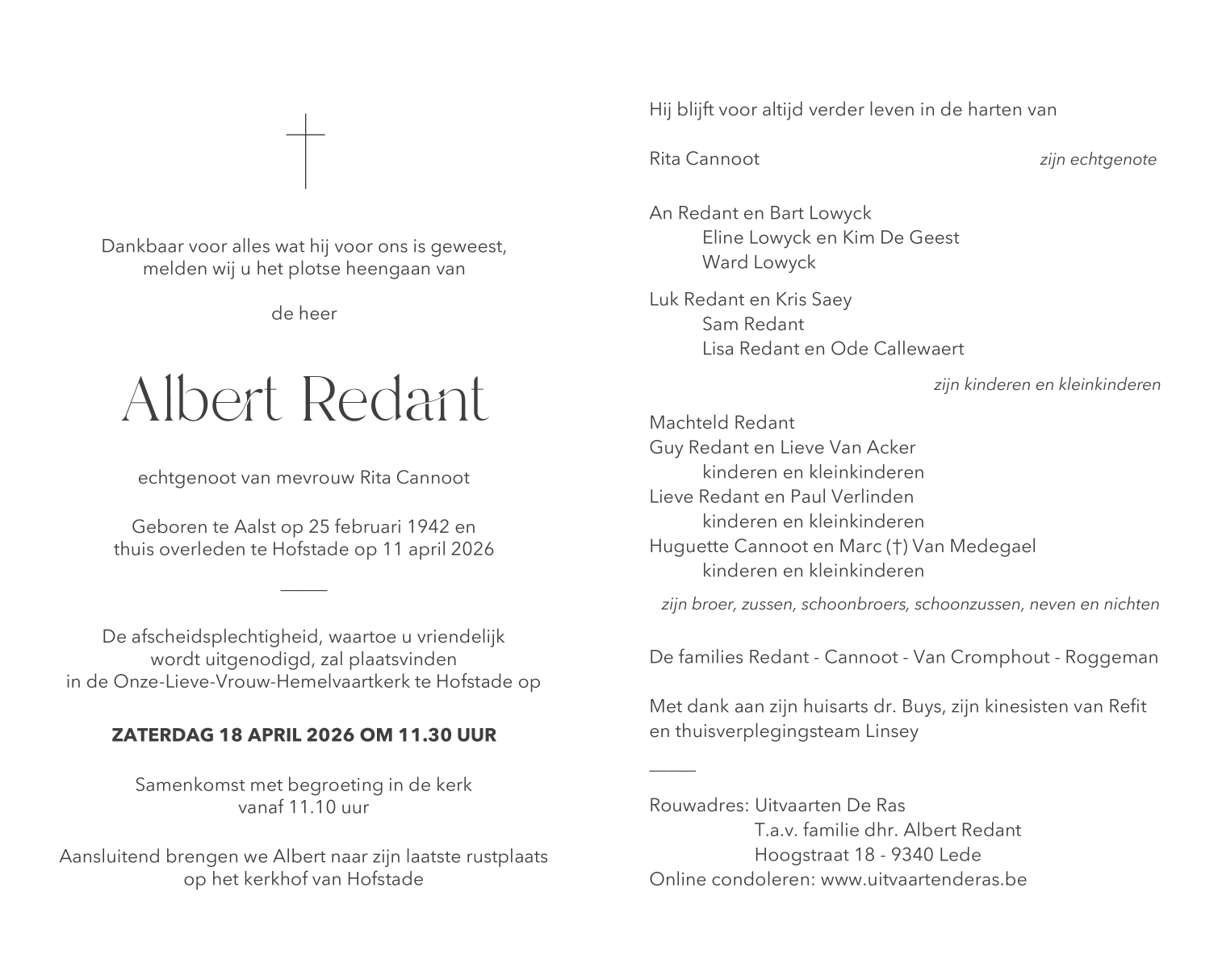 Décédé à Hofstade (O.-Vl.) (9308) le samedi 11 avril 2026 à l'âge de 84 ans