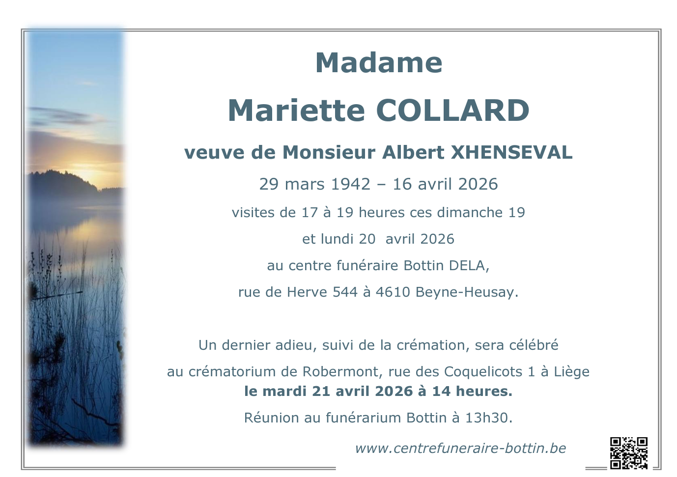 Décédée à Chênée (4032) le jeudi 16 avril 2026 à l'âge de 84 ans