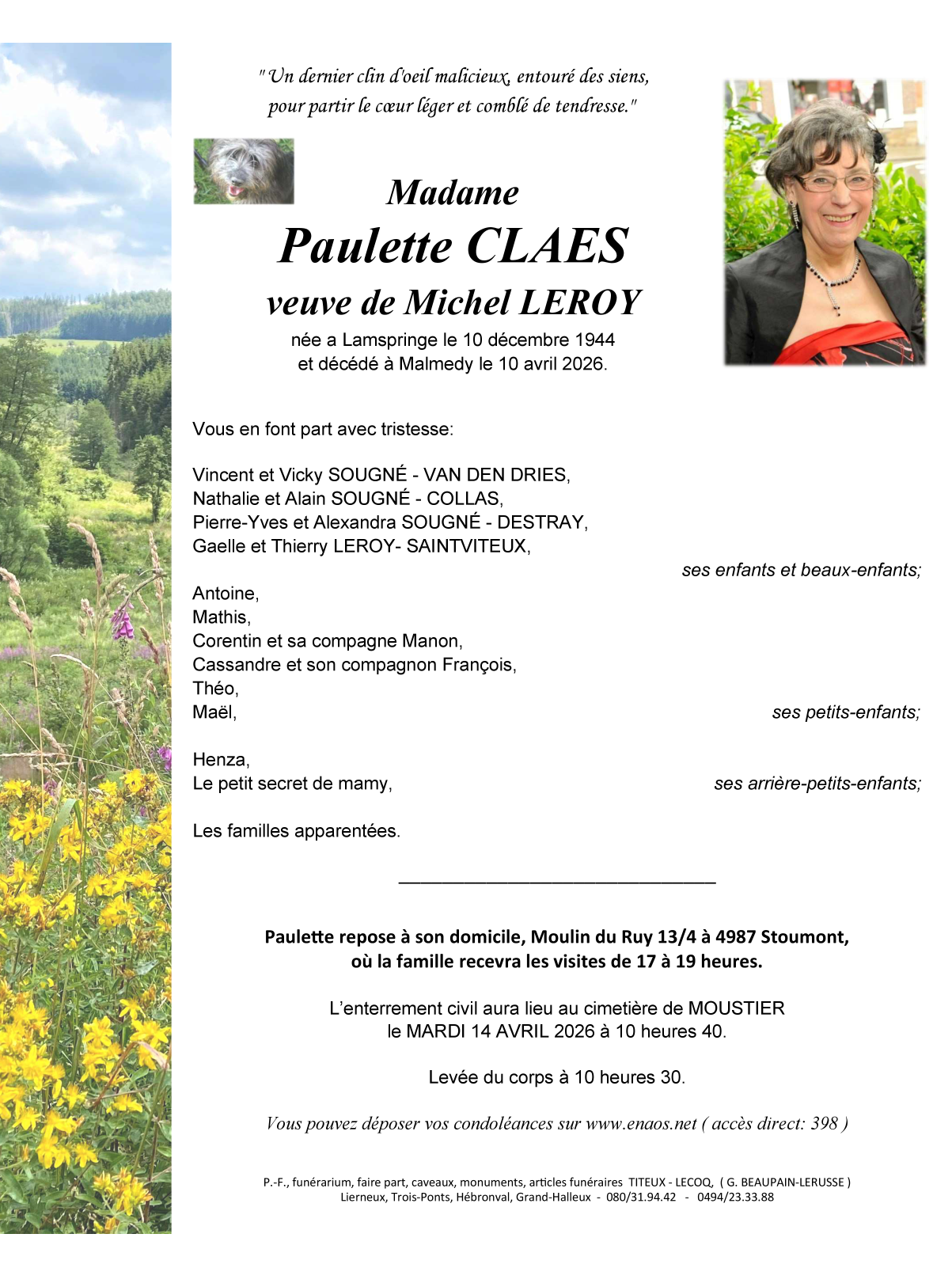 Décédée à Malmedy (4950) le vendredi 10 avril 2026 à l'âge de 81 ans