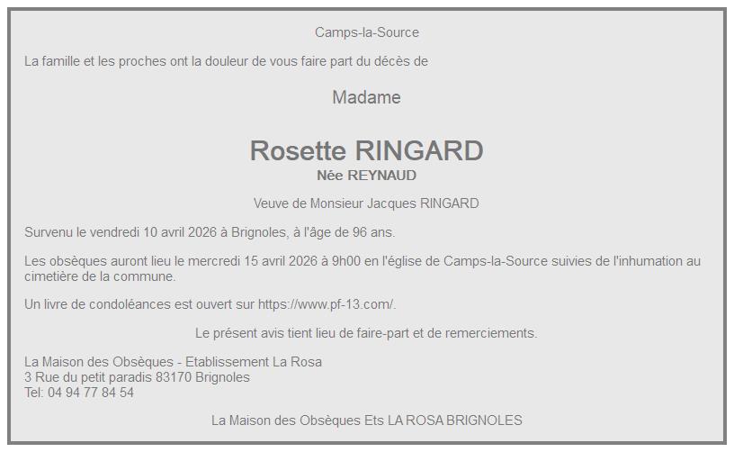 Overlijdensbericht van Madame Rosette RINGARD geboren REYNAUD