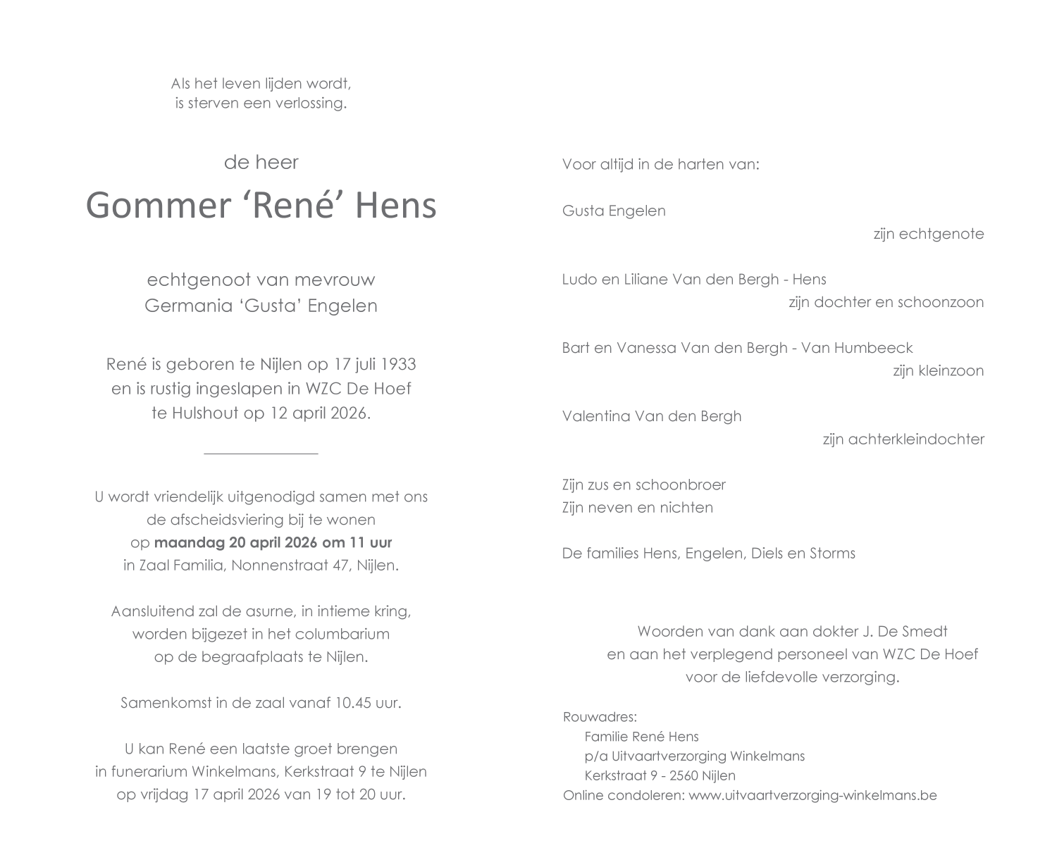 Avis de décès de Monsieur René Hens