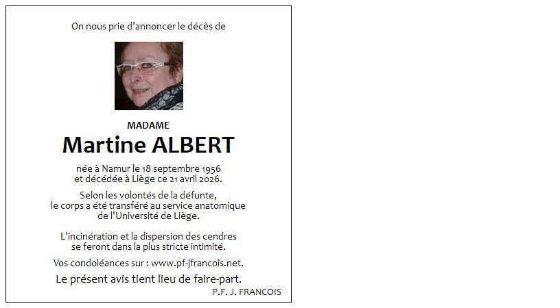 Overlijdensbericht van Mevrouw Martine ALBERT