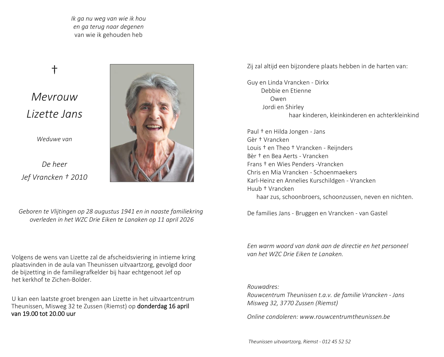 Avis de décès de Madame Lizette Jans