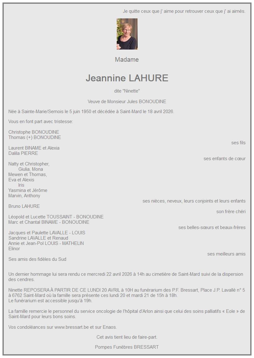 Décédée à Saint-Mard (6762) le samedi 18 avril 2026 à l'âge de 75 ans