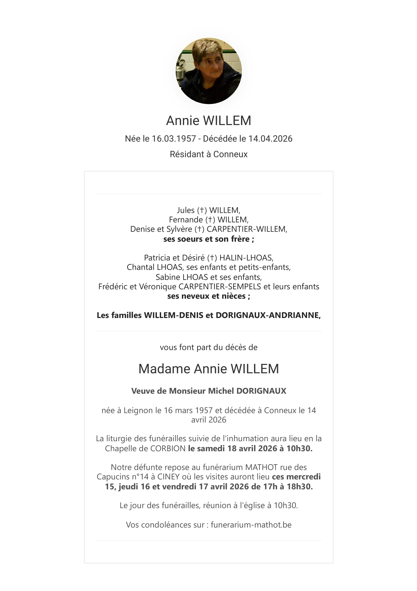 Décédée à Conneux (5590) le mardi 14 avril 2026 à l'âge de 69 ans