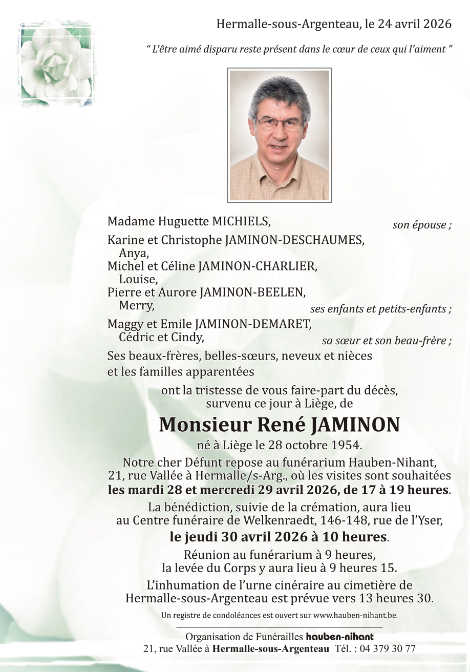 Décédé à Liège (4030) le vendredi 24 avril 2026 à l'âge de 71 ans