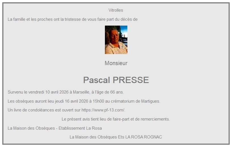 Overlijdensbericht van Monsieur Pascal PRESSE
