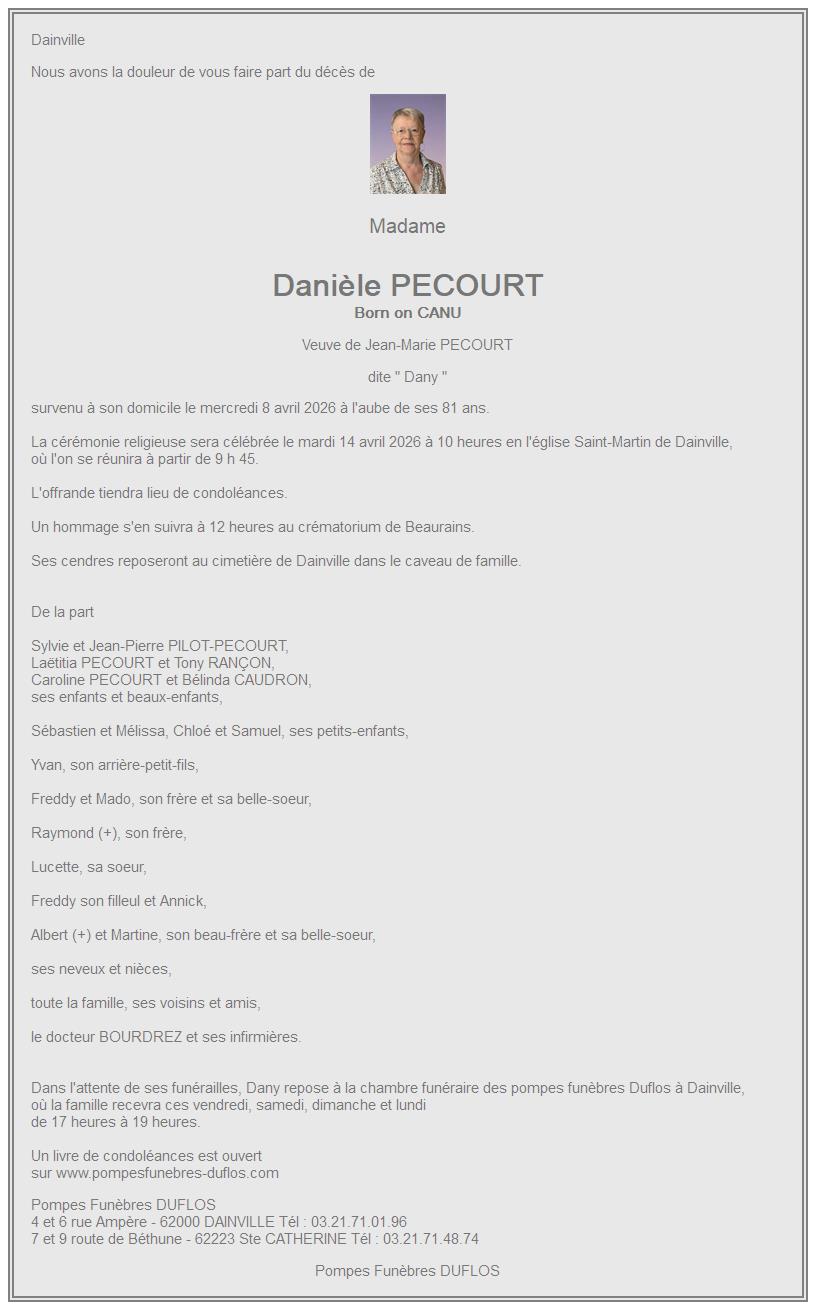 Overlijdensbericht van Madame Danièle PECOURT geboren CANU