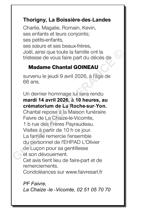 Décédée à Luçon (85400, France) le jeudi 9 avril 2026 à l'âge de 66 ans