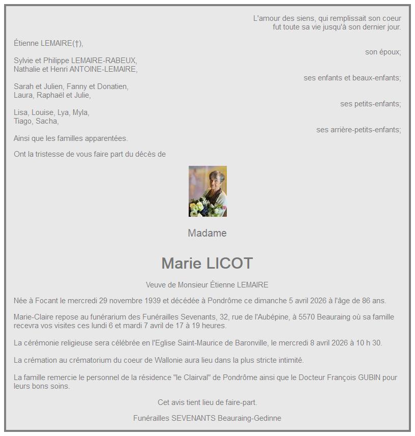 Overlijdensbericht van Madame Marie LICOT