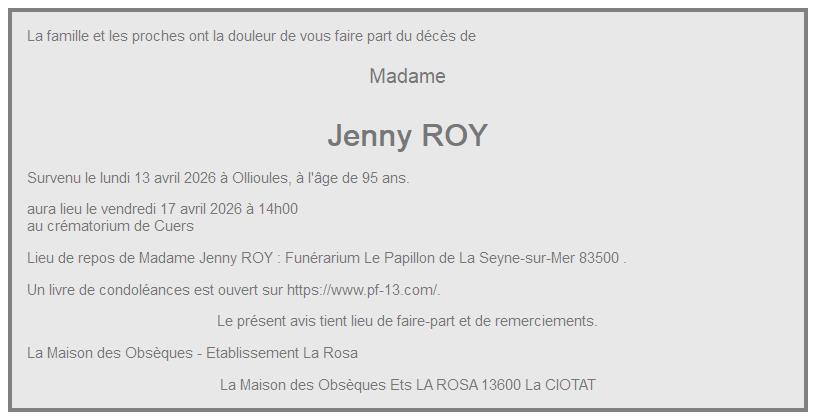 Overlijdensbericht van Madame Jenny ROY