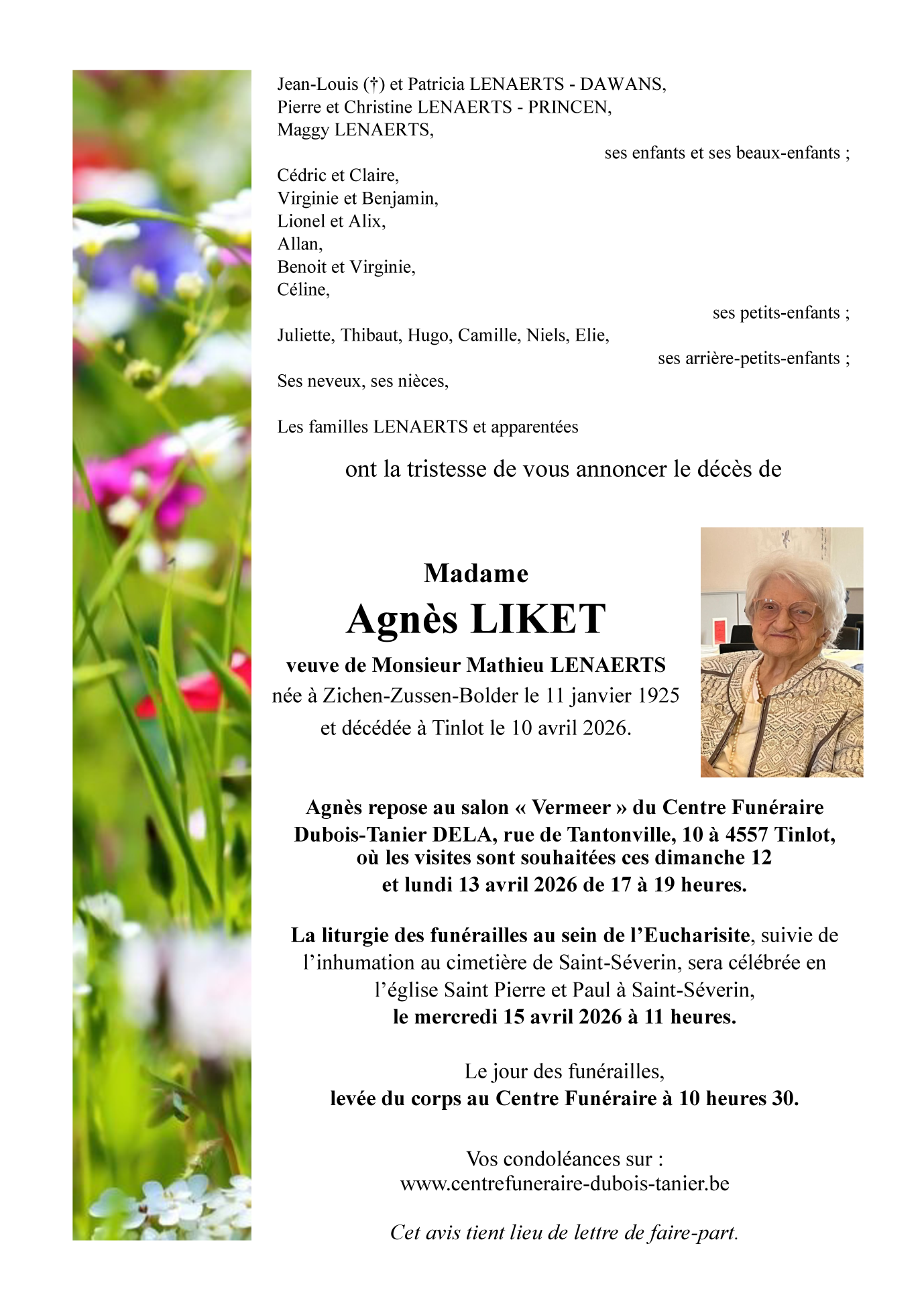 Overlijdensbericht van Mevrouw Agnès LIKET