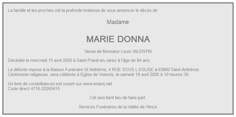 Avis de décès de Madame MARIE VALENTIN née DONNA