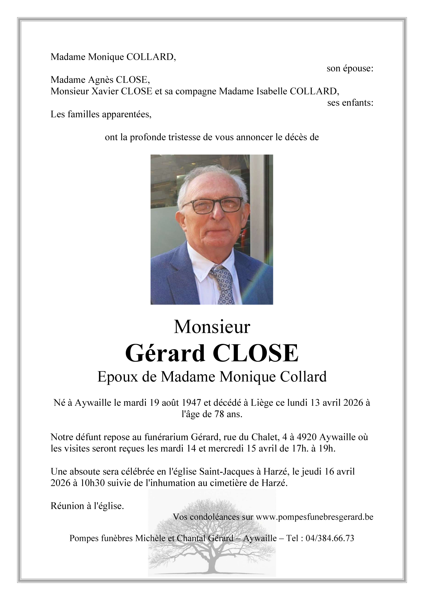 Décédé à Liège (4000) le lundi 13 avril 2026 à l'âge de 78 ans