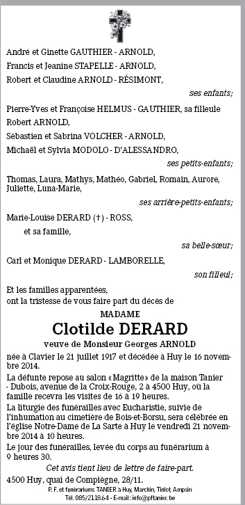 Fallecida en Huy (4500) el domingo, 16 de noviembre de 2014 a la edad de 97 años