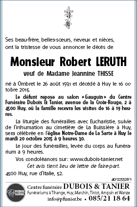 Fallecido en Huy (4500) el viernes, 16 de octubre de 2015 a la edad de 84 años