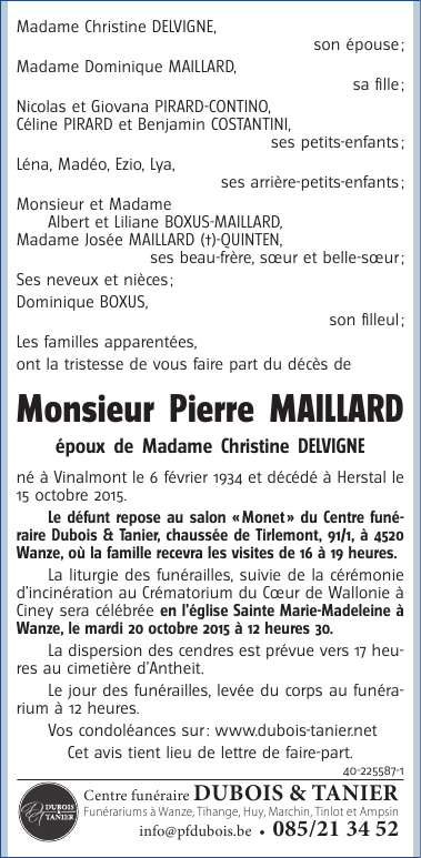 Décédé à Herstal (4040) le jeudi 15 octobre 2015 à l'âge de 81 ans