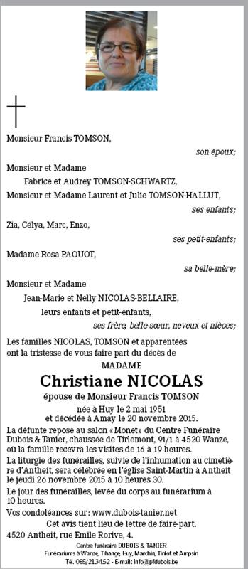 Décédée à Amay (4540) le vendredi 20 novembre 2015 à l'âge de 64 ans