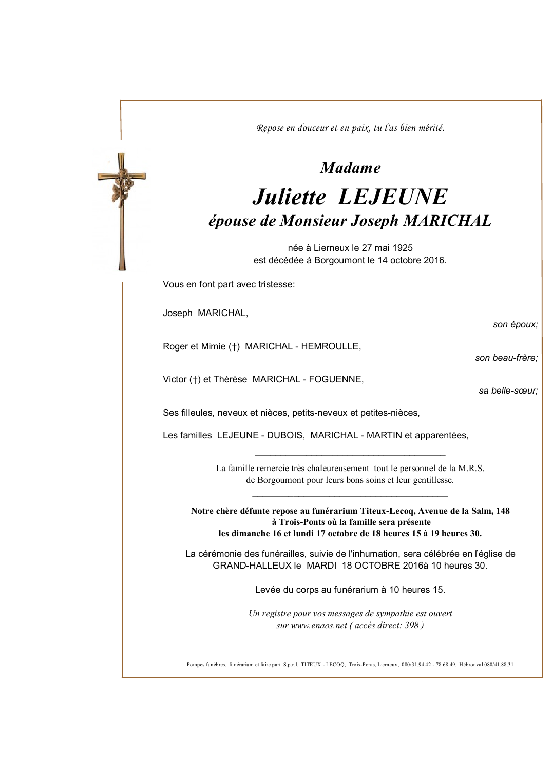 Décédée à Borgoumont (4987) le vendredi 14 octobre 2016 à l'âge de 91 ans