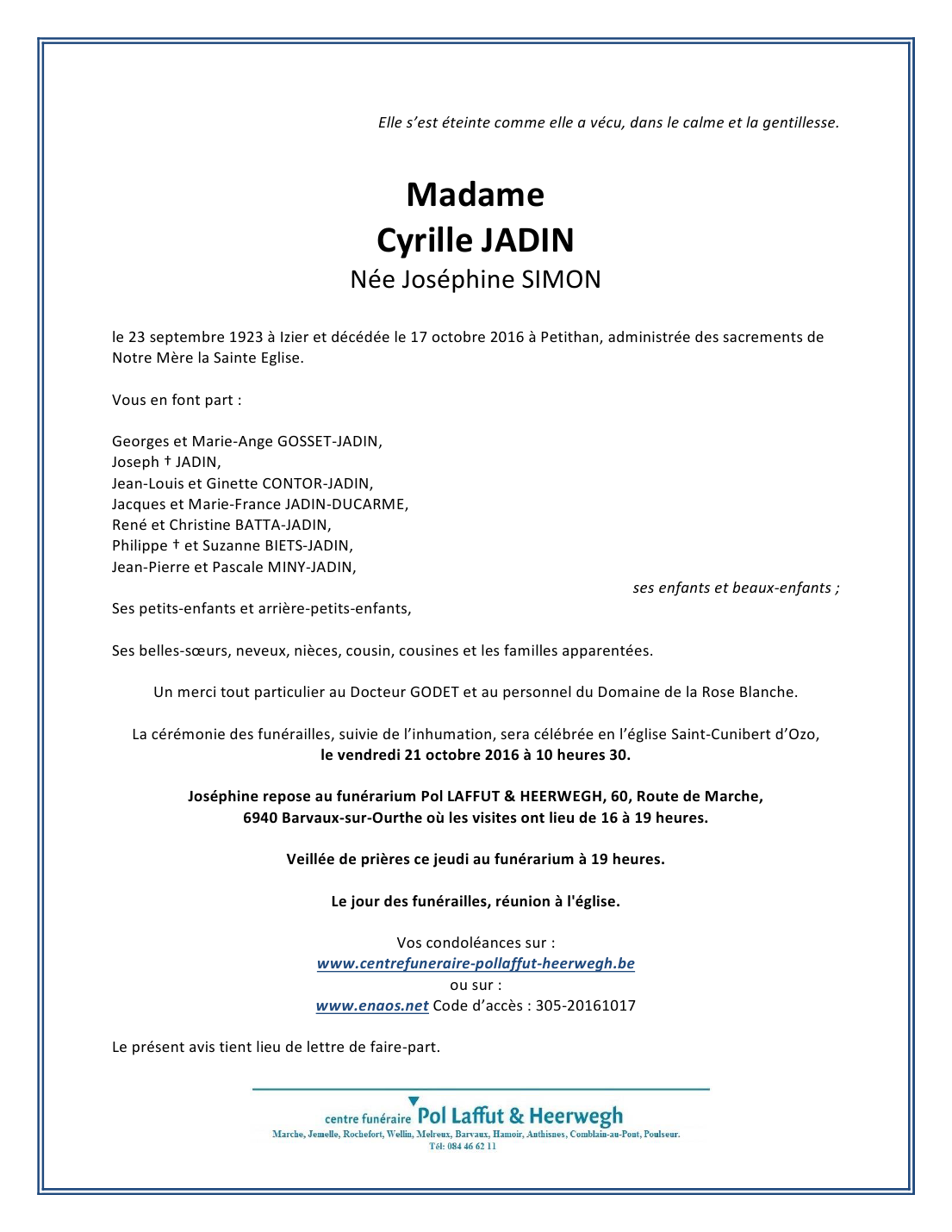 Décédée à Petit-Han (6940) le lundi 17 octobre 2016 à l'âge de 93 ans