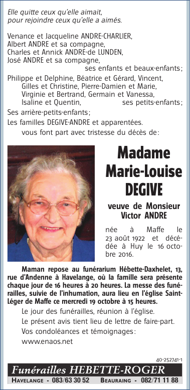 Fallecida en Huy (4500) el domingo, 16 de octubre de 2016 a la edad de 94 años
