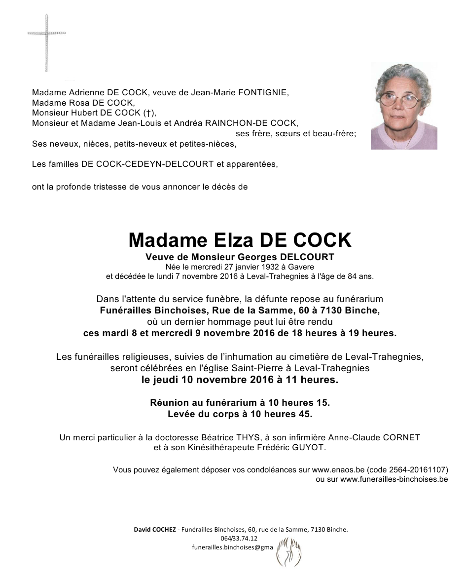 Décédée à Leval-Trahegnies (7134) le lundi 7 novembre 2016 à l'âge de 84 ans