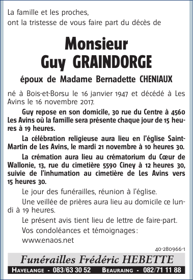Décédé à Les Avins (4560) le jeudi 16 novembre 2017 à l'âge de 70 ans