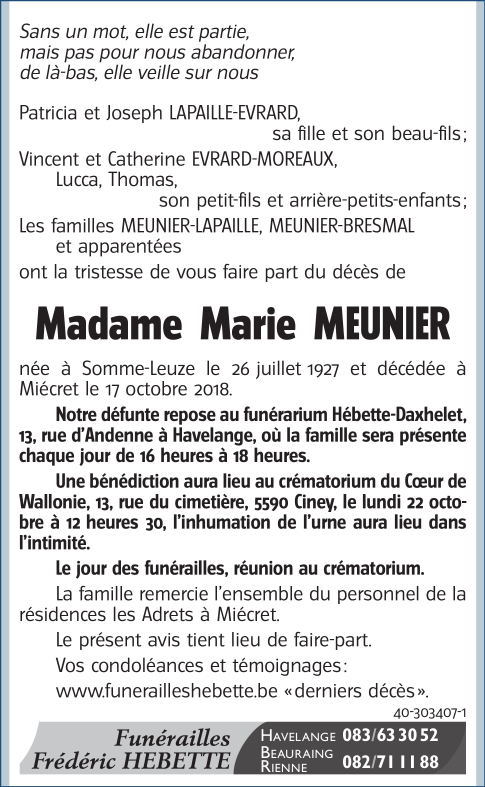 Décédée à Miécret (5376) le mercredi 17 octobre 2018 à l'âge de 91 ans