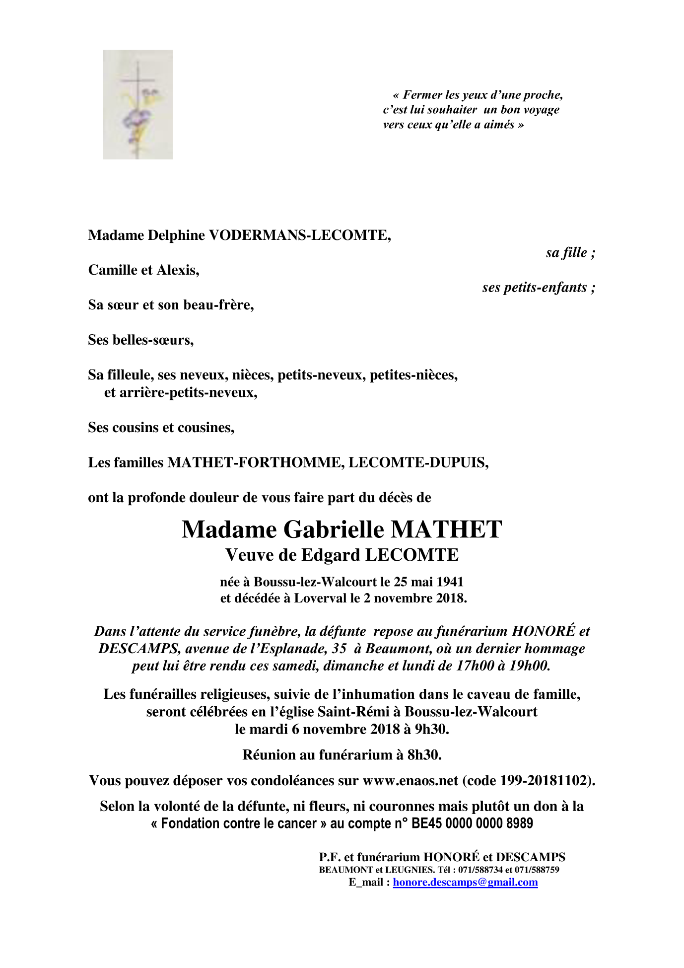 Décédée à Loverval (6280) le vendredi 2 novembre 2018 à l'âge de 77 ans