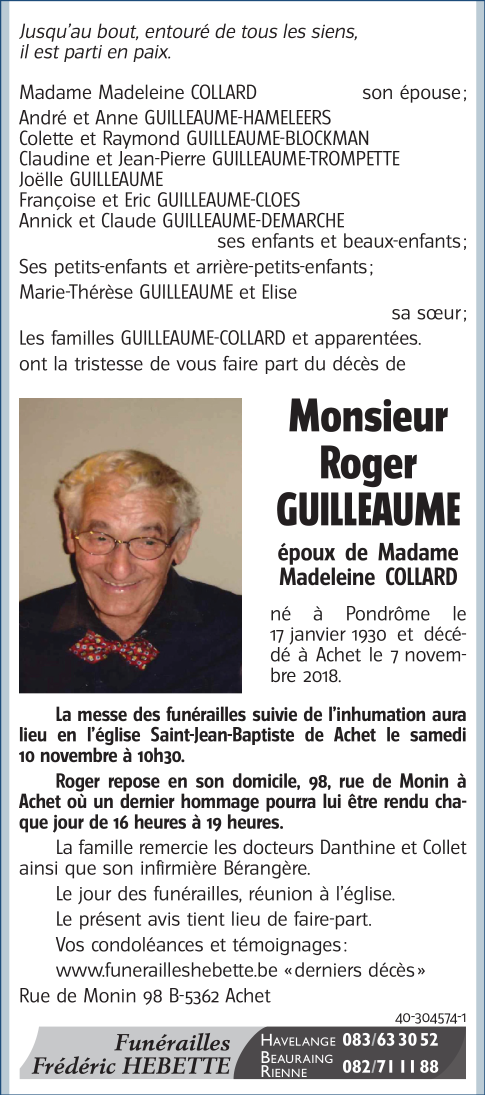 Décédé à Achet (5362 ) le mercredi 7 novembre 2018 à l'âge de 88 ans