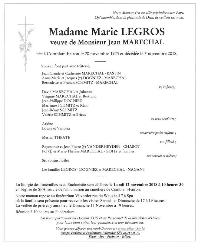 Décédée à Spa (4900) le mercredi 7 novembre 2018 à l'âge de 94 ans