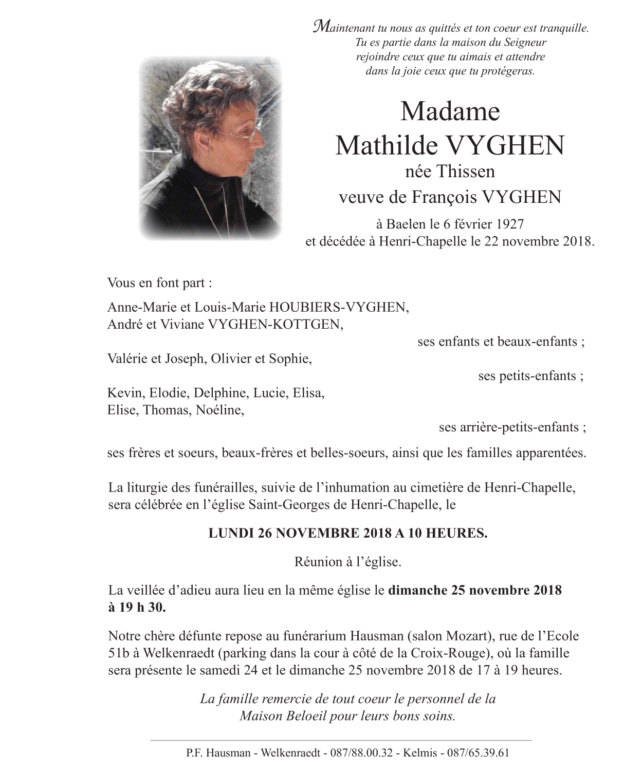 Décédée à Henri-Chapelle (4841 ) le jeudi 22 novembre 2018 à l'âge de 91 ans