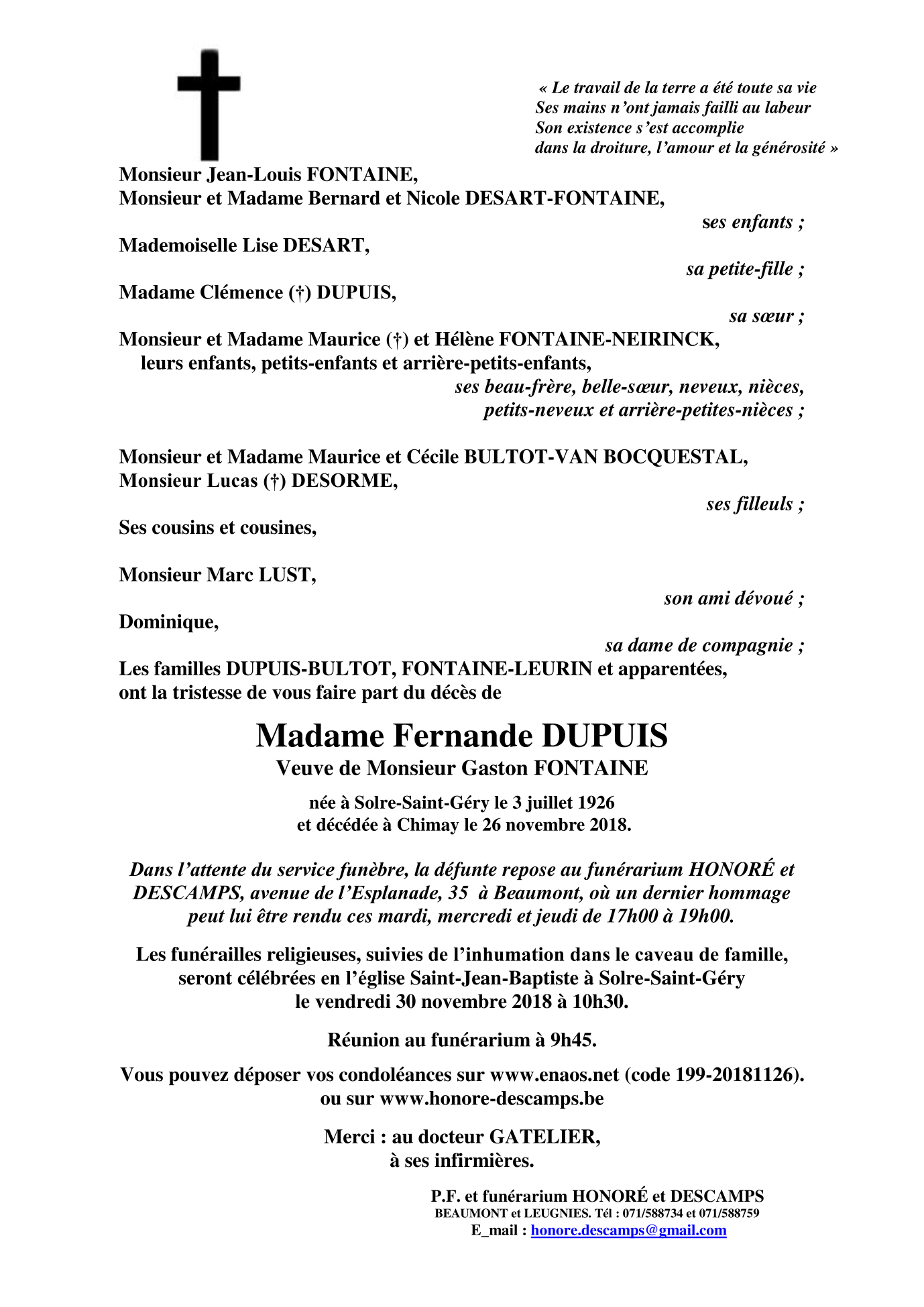 Née à Solre-Saint-Géry (6500) le samedi 3 juillet 1926