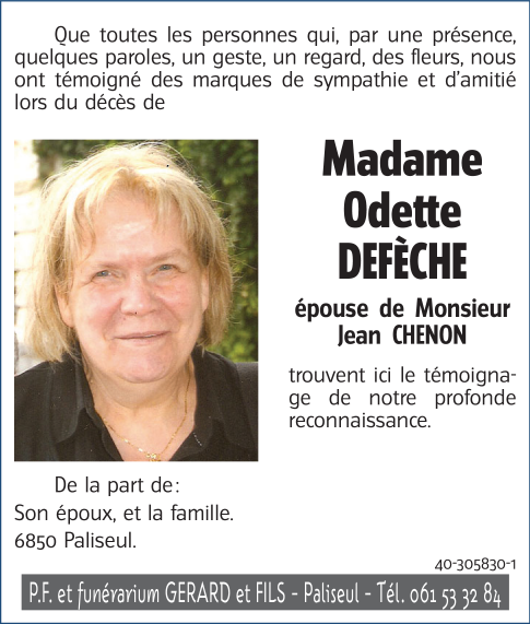 Décédée à Paliseul (6850) le lundi 19 novembre 2018 à l'âge de 69 ans
