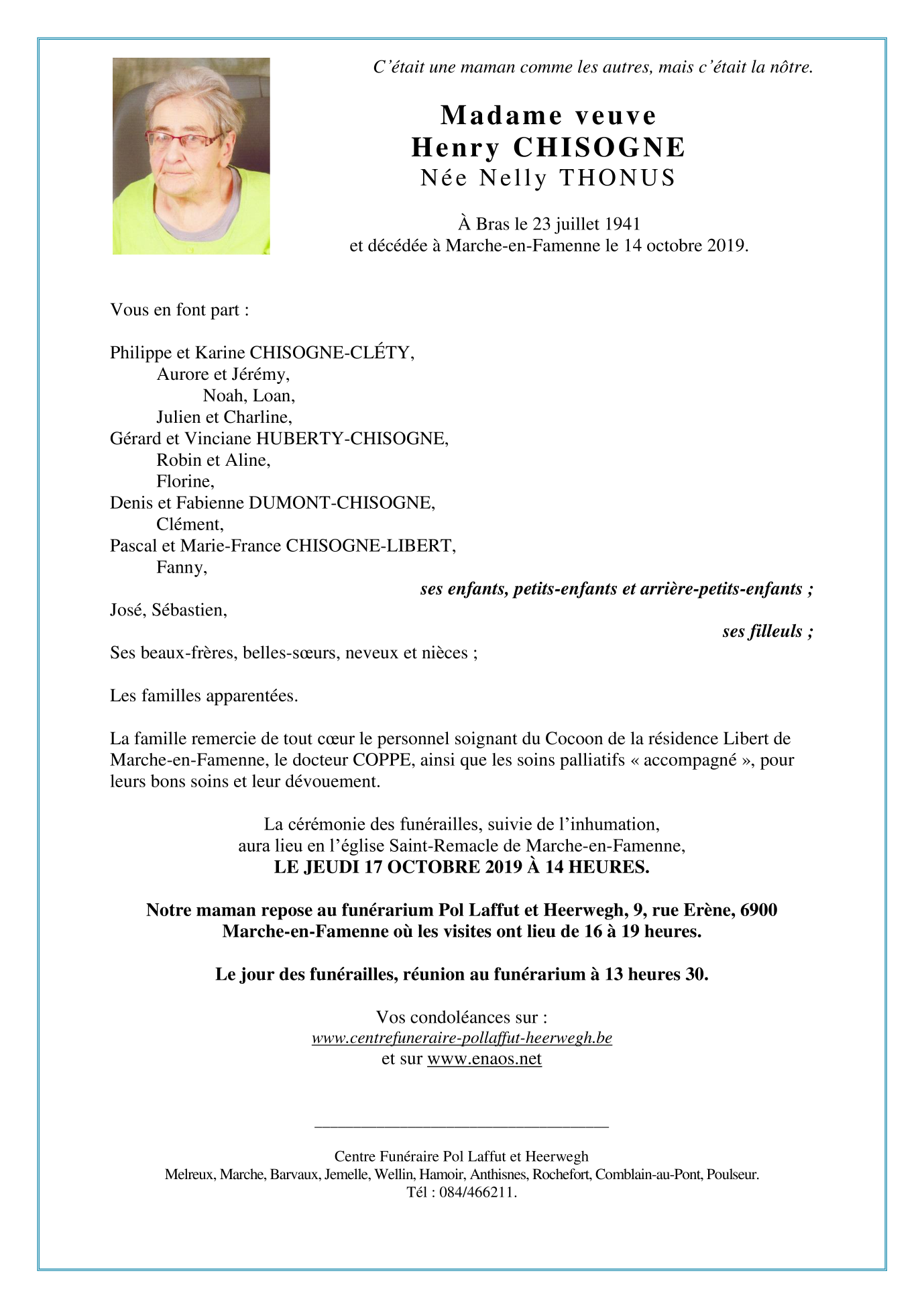Décédée à Marche-en-Famenne (6900) le lundi 14 octobre 2019 à l'âge de 78 ans