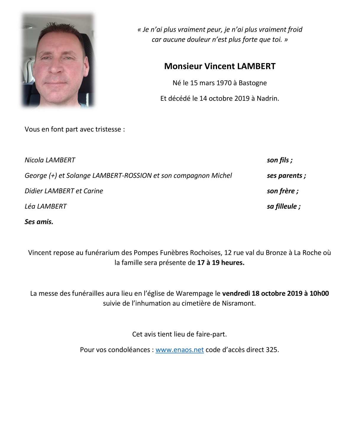 Died in Nadrin (6660) on 14 October 2019 at the age of 49 years