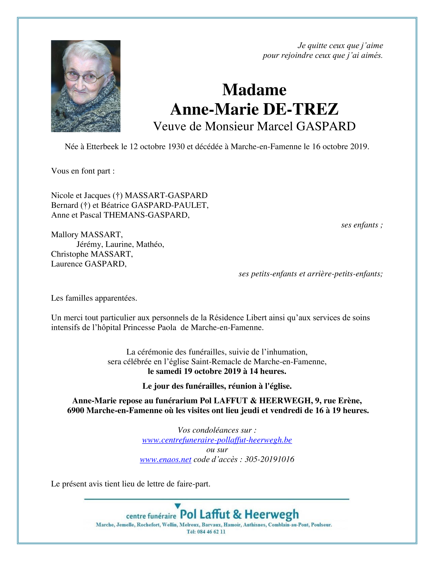 Overleden te Aye (6900) op woensdag 16 oktober 2019 op 89-jarige leeftijd