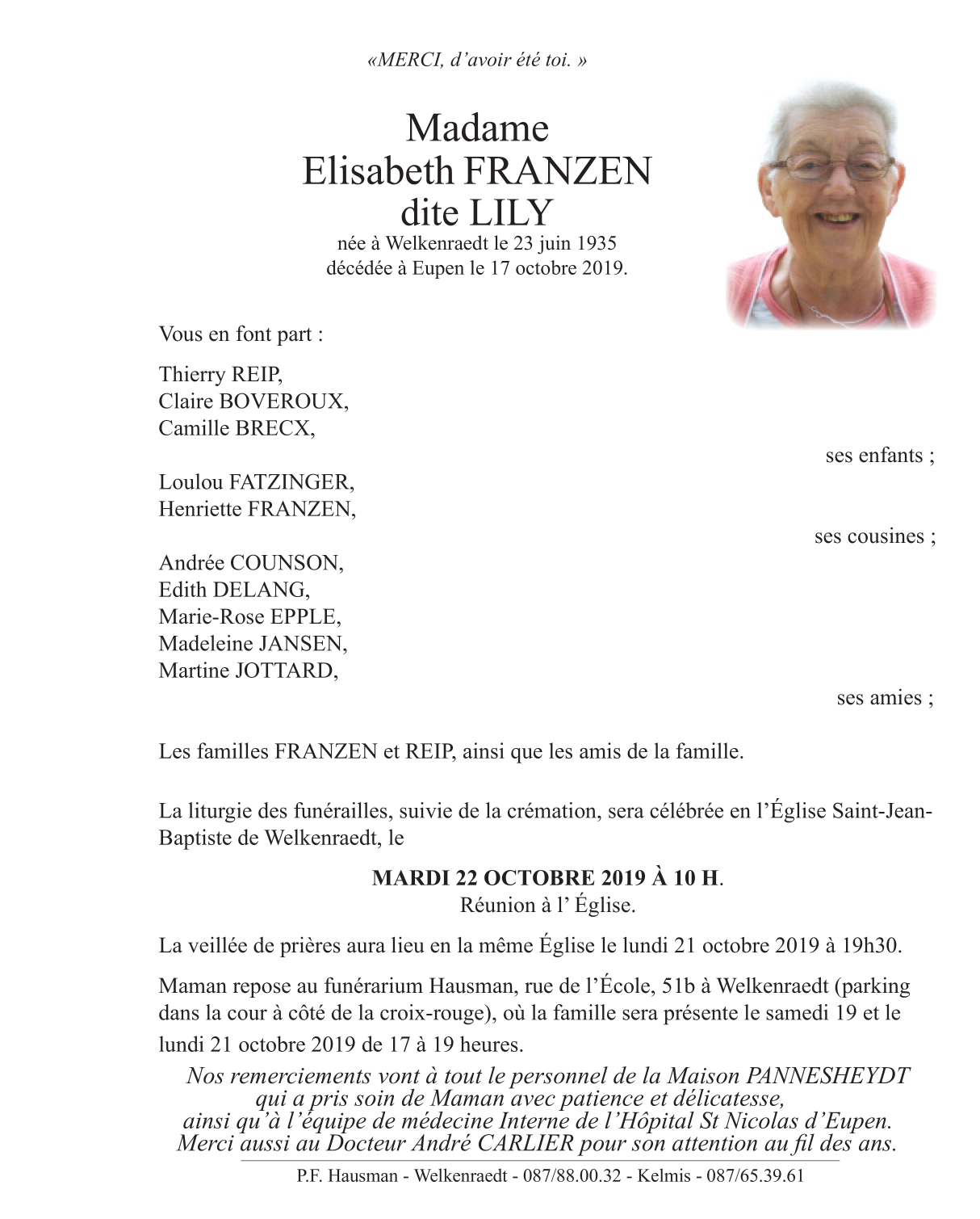 Fallecida en Eupen (4700) el jueves, 17 de octubre de 2019 a la edad de 84 años