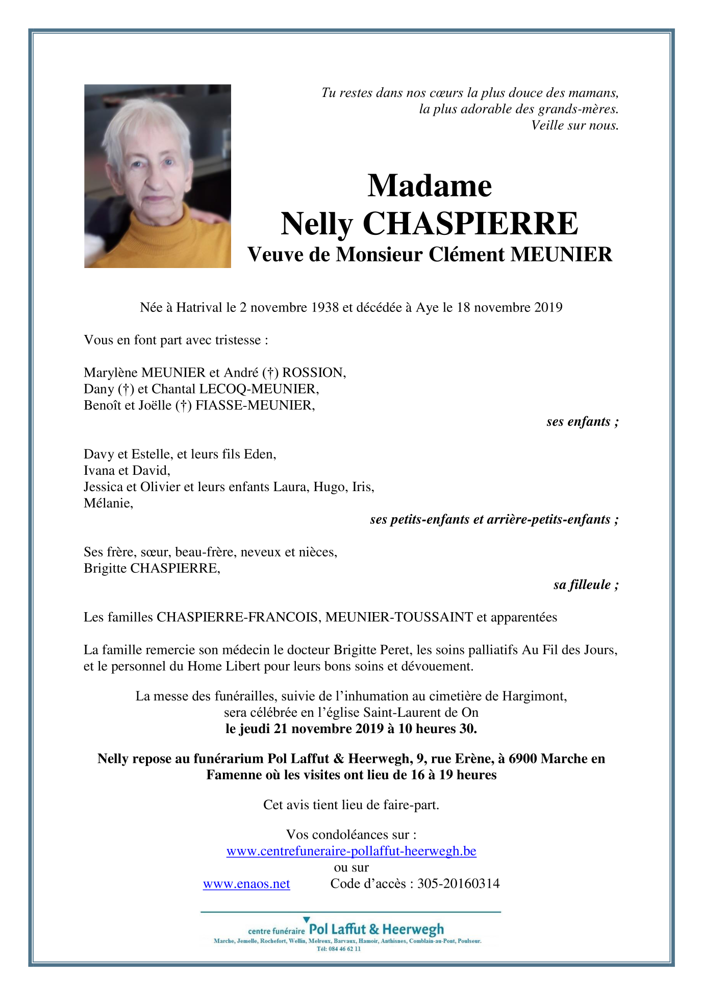 Décédée à Aye (6900) le lundi 18 novembre 2019 à l'âge de 81 ans