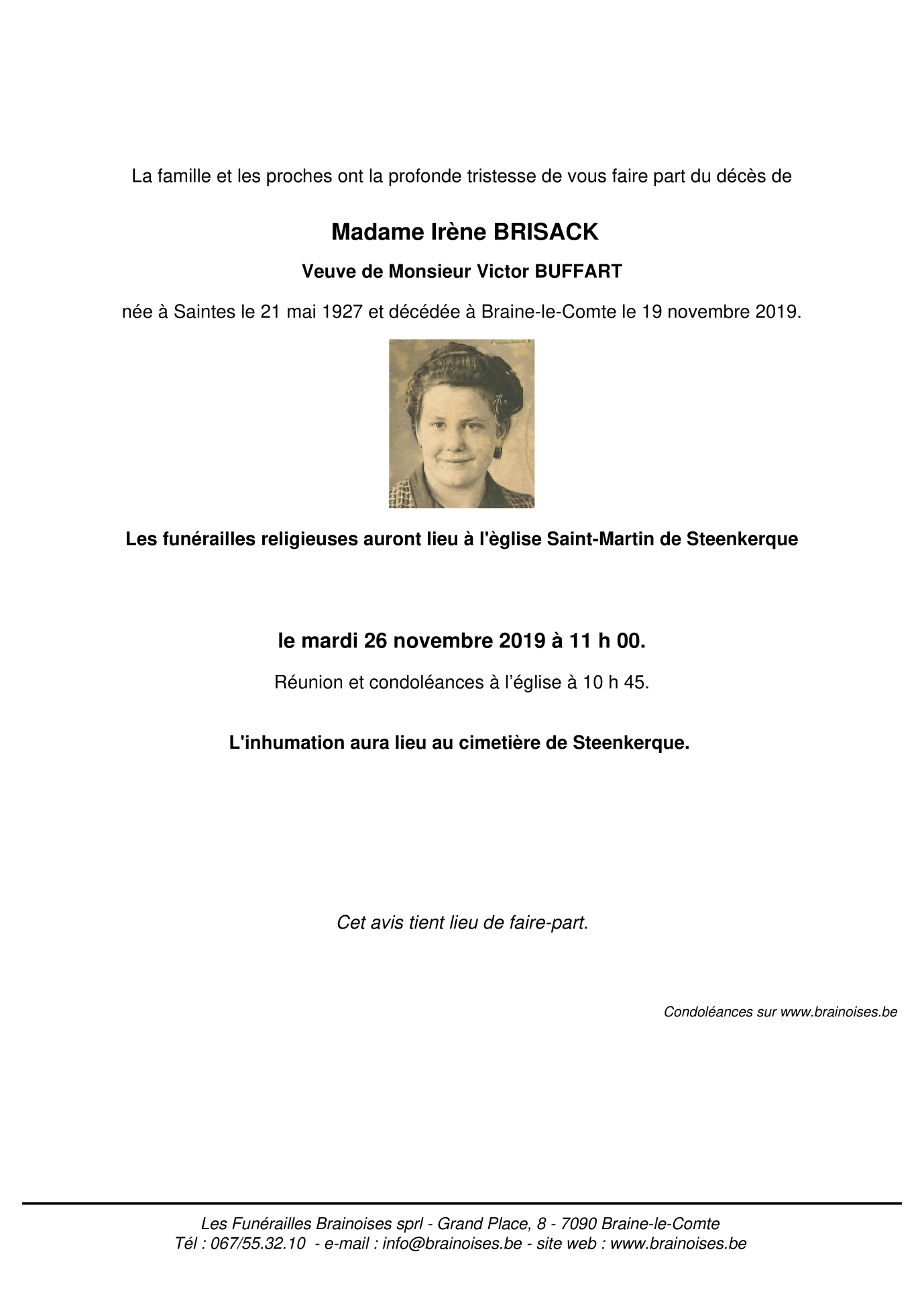 Décédée à Braine-le-Comte (7090) le mardi 19 novembre 2019 à l'âge de 92 ans