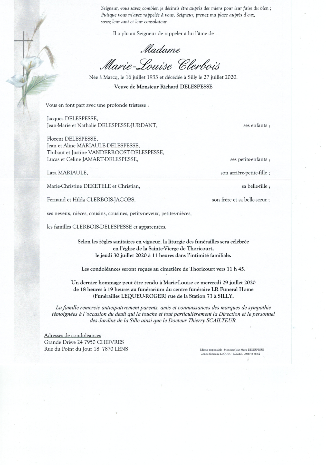 Décédée à Silly (7830) le lundi 27 juillet 2020 à l'âge de 87 ans