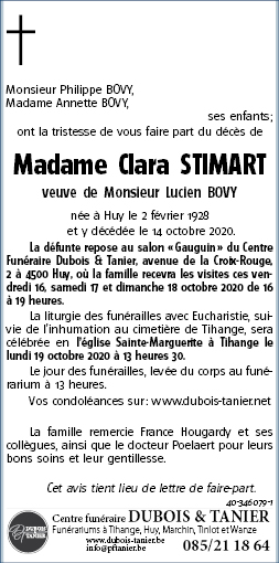Fallecida en Huy (4500) el miércoles, 14 de octubre de 2020 a la edad de 92 años