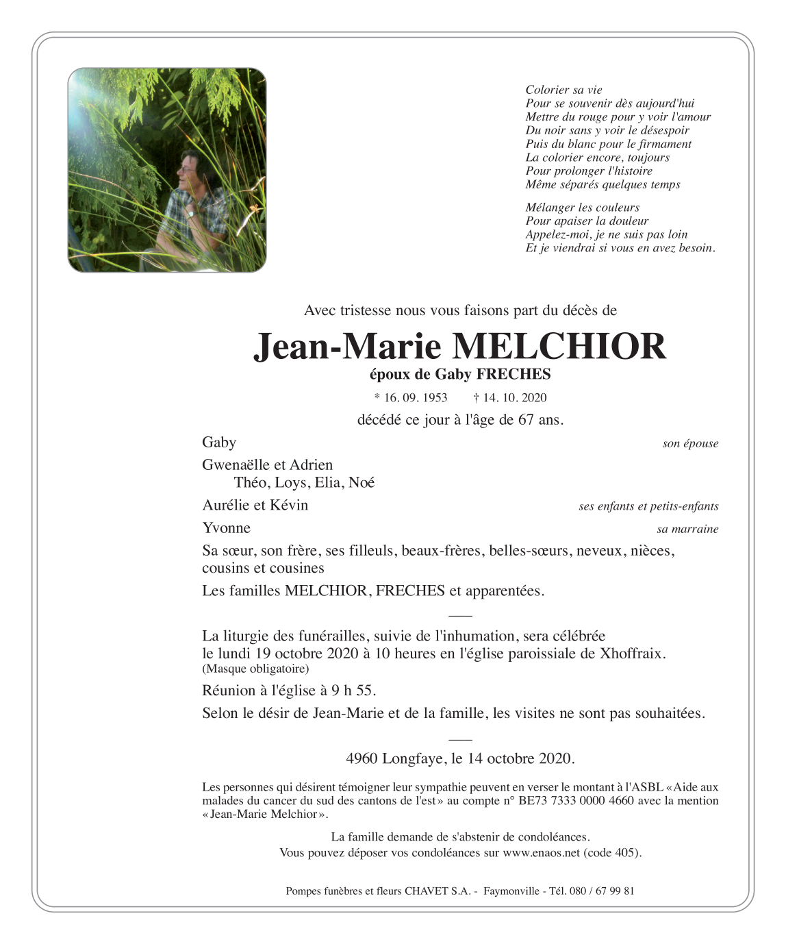 Died in Longfaye (4960) on 14 October 2020 at the age of 67 years