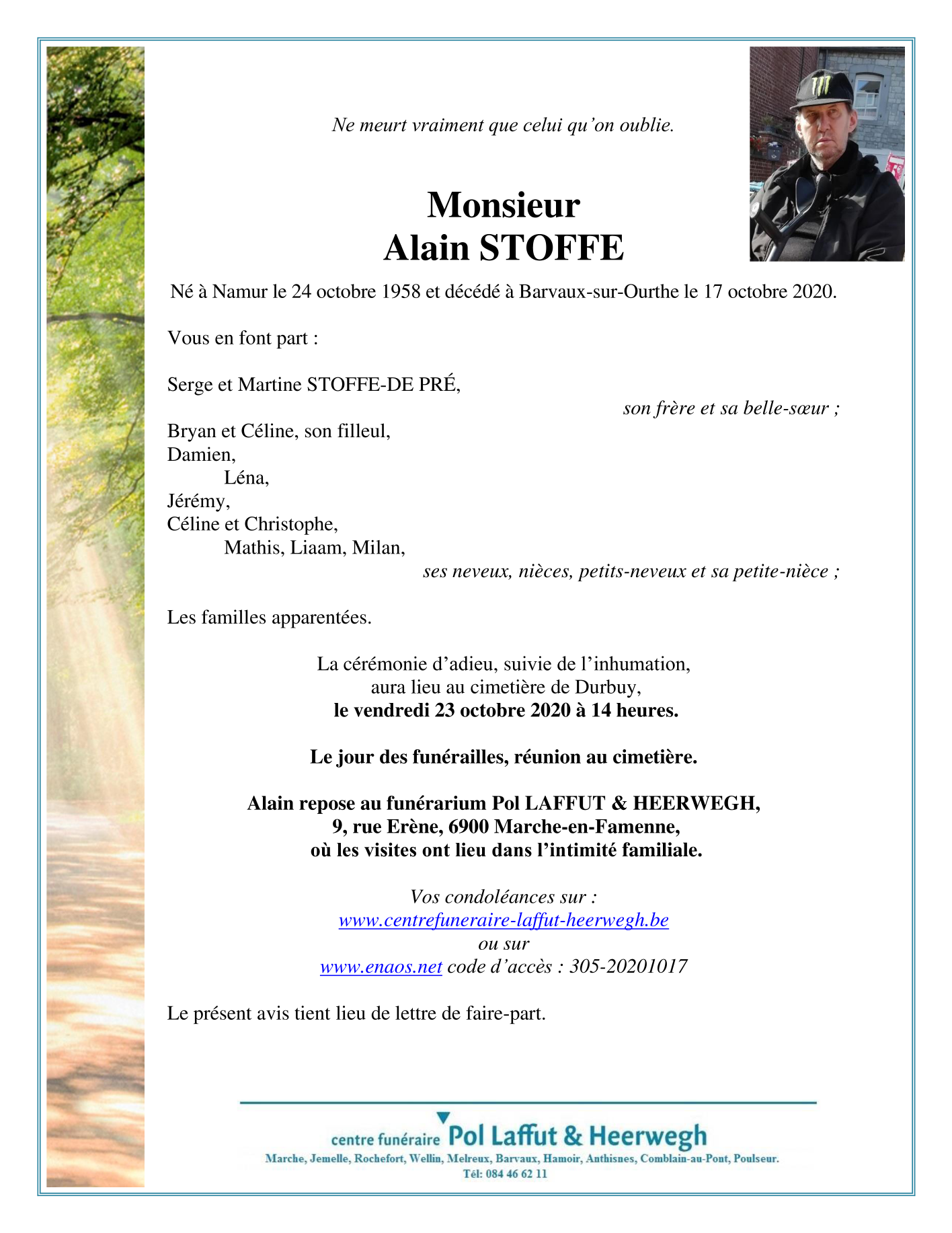 Fallecido en Barvaux-sur-Ourthe (6940) el sábado, 17 de octubre de 2020 a la edad de 61 años