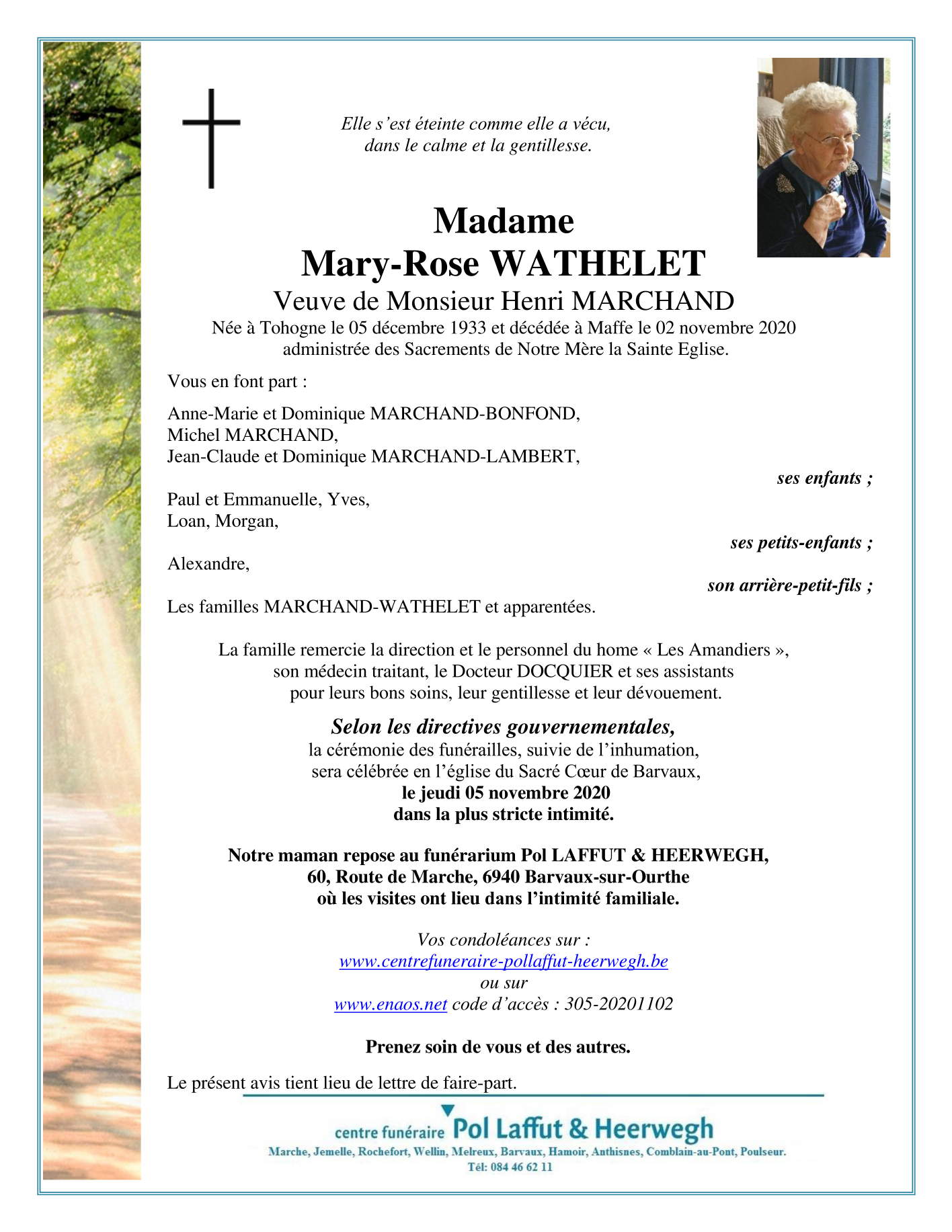 Décédée à Maffe (5374) le lundi 2 novembre 2020 à l'âge de 86 ans