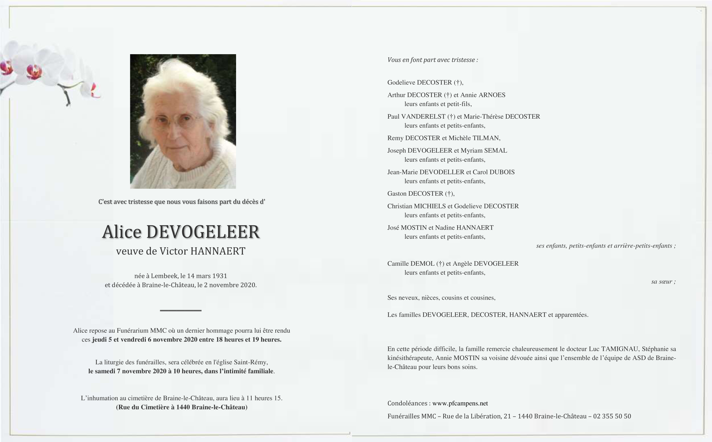 Décédée à Braine-le-Château (1440) le lundi 2 novembre 2020 à l'âge de 89 ans