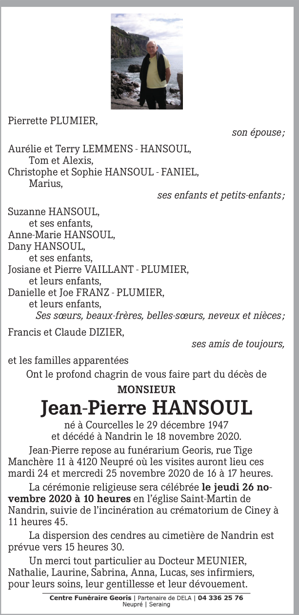 Décédé à Nandrin (4550) le mercredi 18 novembre 2020 à l'âge de 72 ans